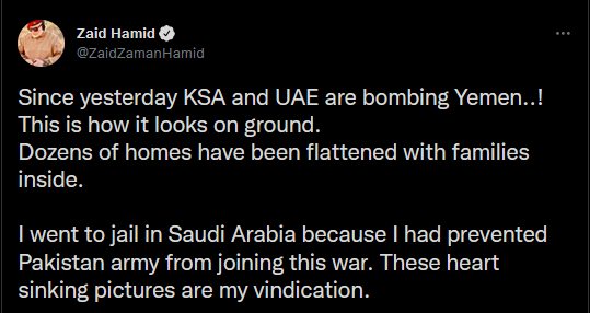 Since yesterday KSA and UAE are bombing Yemen..! This is how it looks on ground. Dozens of homes have been flattened with families inside. I went to jail in Saudi Arabia because I had prevented Pakistan army from joining this war. These heart sinking pictures are my vindication.