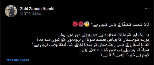 50 فیصد کینیڈا کے پاس کیوں ہے؟ 😨🤬😡 یہ ایک اور شرمناک معاہدہ ہے جو پچھلے دور میں ہوا۔ پورے بلوچستان کا پچاس فیصد سونا ان یہودیوں کو کیوں دے دیا؟ کیا پاکستان کے پاس ریت چھان کر سونا نکالنے کی ٹیکنالوجی نہیں ہے؟ سینڈک ہم پہلے ہی چین کو دے چکے ہیں۔۔ کون بے غیرت ایسے کرتا ہے؟