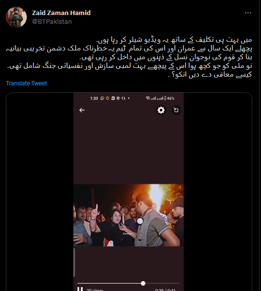 میں بہت ہی تکلیف کے ساتھ یہ ویڈیو شیئر کر رہا ہوں۔ پچھلے ایک سال سے عمران اور اس کی تمام ٹیم یہ خطرناک ملک دشمن تخریبی بیانیہ بنا کر قوم کی نوجوان نسل کے ذہنوں میں داخل کر رہی تھی۔ نو مئی کو جو کچھ ہوا اس کے پیچھے بہت لمبی سازش اور نفسیاتی جنگ شامل تھی۔ کیسے معافی دے دیں انکو؟ ۔