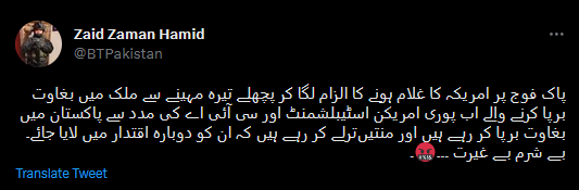 پاک فوج پر امریکہ کا غلام ہونے کا الزام لگا کر پچھلے تیرہ مہینے سے ملک میں بغاوت برپا کرنے والے اب پوری امریکن اسٹیبلشمنٹ اور سی آئی اے کی مدد سے پاکستان میں بغاوت برپا کر رہے ہیں اور منتیںترلے کر رہے ہیں کہ ان کو دوبارہ اقتدار میں لایا جائے۔ بے شرم بے غیرت ۔۔۔🤬۔